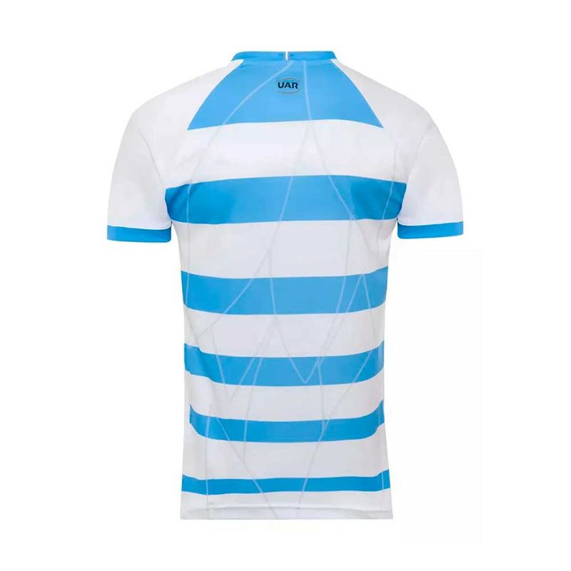 La camiseta titular de Los Pumas mantiene las características franjas horizontales celestes y blancas inspiradas en el color de nuestra bandera y un cuello redondo celeste. En el pecho se destacan laureles, que son el símbolo de la gloria y la determinación de este equipo para alcanzar la grandeza, y la enorme responsabilidad que lleva vestir esta camiseta en los laterales, se presentan dos franjas verticales celestes con los característicos laureles.