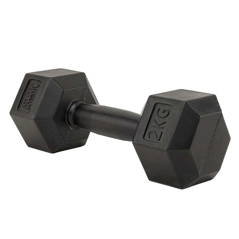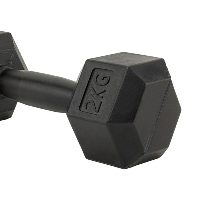 Mancuerna de 2kg en PVC color negro, ideal para tonificación y ejercicios de fuerza. Compacta, resistente y con agarre antideslizante, perfecta para usar en casa o en el gimnasio.