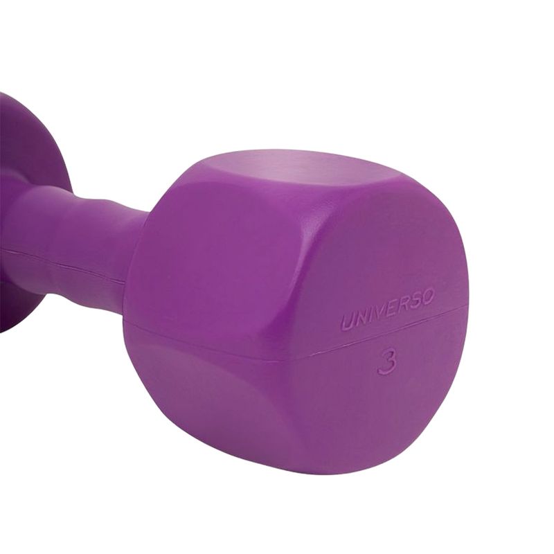 Mancuerna de 3kg en PVC color violeta, ideal para tonificación y ejercicios de fuerza. Compacta, resistente y con agarre antideslizante, perfecta para usar en casa o en el gimnasio.