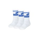 Las Medias Nike Futura Pack X3 son medias de caña alta que combinan un estilo deportivo clásico con comodidad para uso diario, entrenar, o un outfit casual. Están confeccionadas con un tejido suave y elástico que puede incluir tecnología Dri-FIT para ayudar a mantener los pies secos. Las medias cuentan con talón y dedos reforzados para mayor durabilidad y malla para transpirabilidad. Su diseño icónico incluye el logo de Nike (swoosh) y rayas en azul en el puño, aportando un toque deportivo